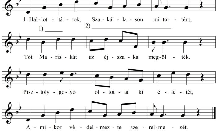 1. Hallottátok, Szakállason mi történt, Tót Mariskát az éjszaka megölték. Pisztoly golyó oltotta ki életét, Amikor védelmezte szerelmesét. 2. Tót...