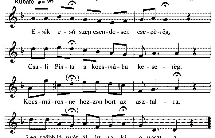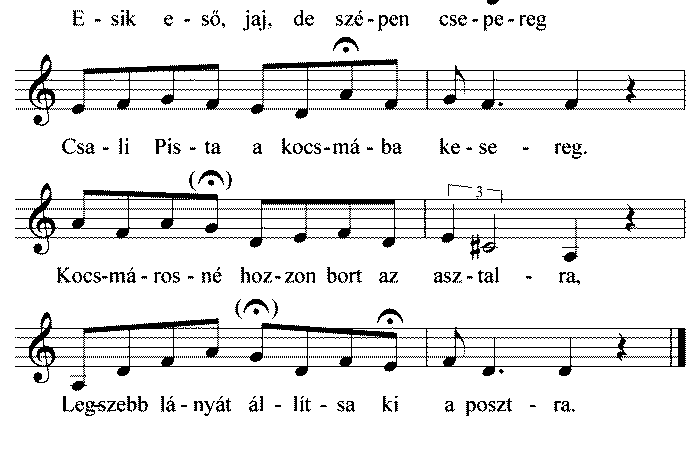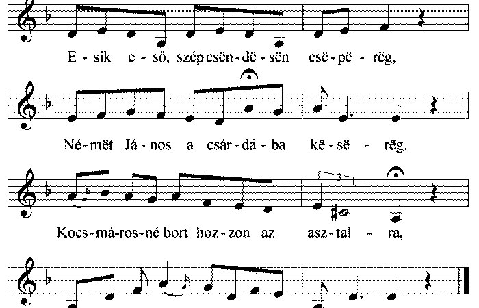 Esik eső, szép csëndësën csëpërëg, Némët János a csárdába kësërëg. — Kocsmárosné bort hozzon az asztalra, Lëgszëbb lányát állitsa ki...