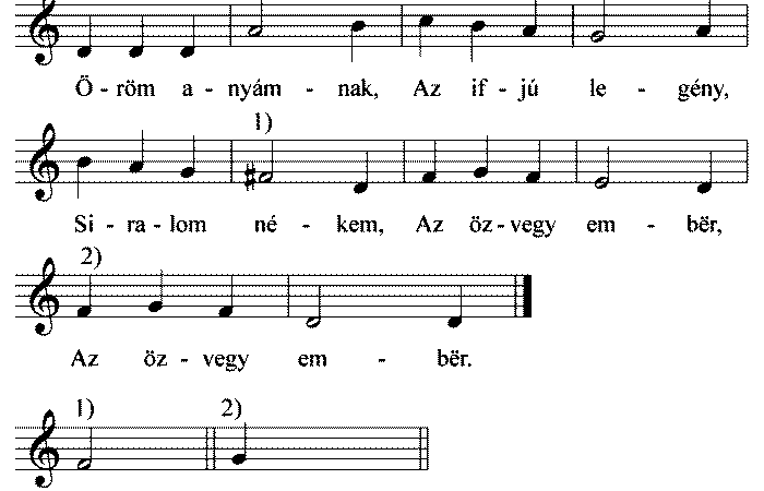 Öröm anyámnak, Az ifjú legény, Siralom nékem, Az özvegy embër, Az özvegy embër. Anyámat vittík, Hat lovon hintón, Ëngëm is...