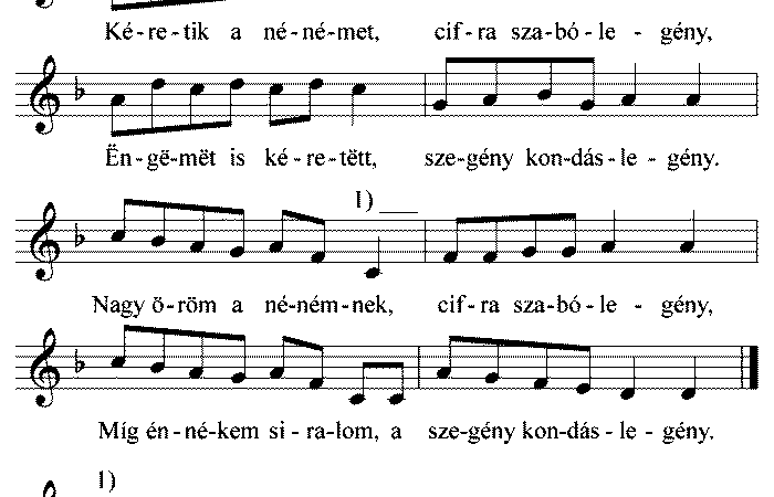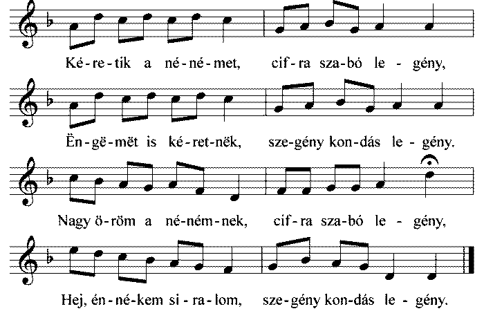 Kéretik a nénémet – cifra szabólegény, Ëngëmët is kéretëtt – szegény kondáslegény. Nagy öröm a nénémnek – cifra szabólegény, Míg...