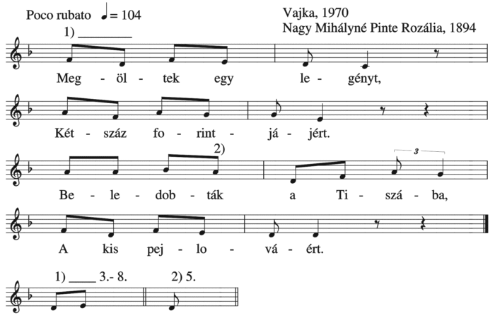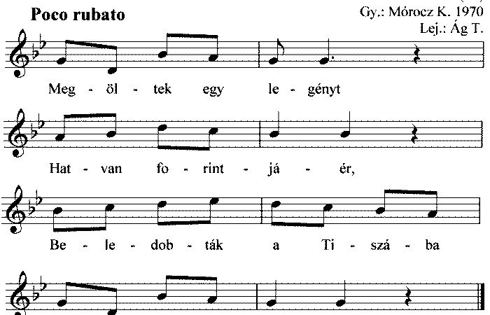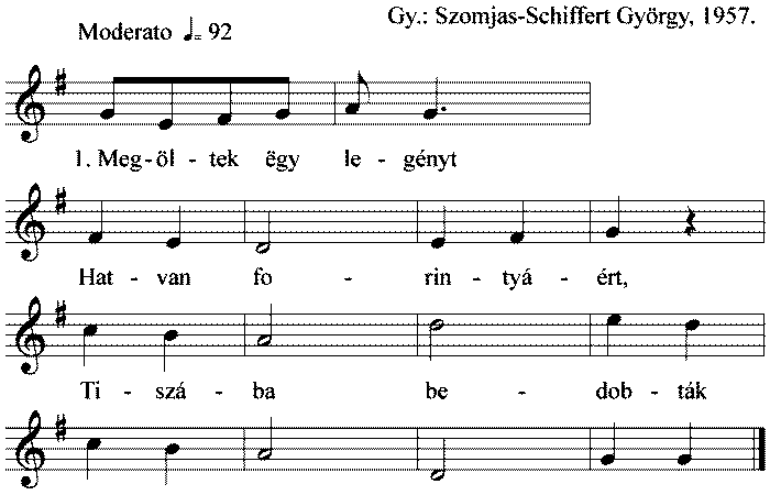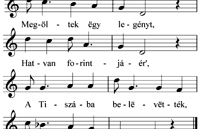 1. Megöltek ëgy legényt, Hatvan forintjáér’, A Tiszába belëvëtték, Sötét pejlováér’. 2. Tisza bë nem vëtte, Partjára kitëtte, Arra mënt...