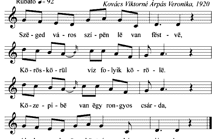 Szëged város szípën lë van fëstvë, Körös-körül víz folyik körölë. Közepibë van ëgy rongyos csárda. Abba mulat ëgy bëtyár bújába....