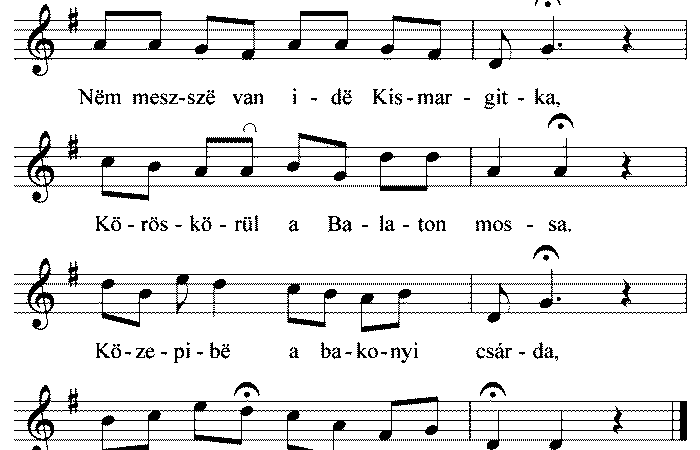 Nëm messzë van idë Kismargitka, Körös-körül a Balaton mossa. Közepibë, a bakonyi csárda, Abba mulat ëgy bëtyár bújába. Onnan alól...