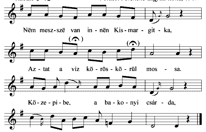 Nëm messzë van innën Kismargitka, Aztat a víz körös-körül mossa, Közepibe, a bakonyi csárda, Abba mulat ëgy bëtyár magába. –...