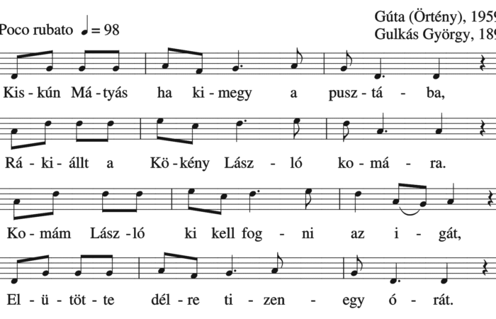 Kiskún Mátyás ha kimegy a pusztára, Rákiállt a Kökény László komára. Komám László, ki kell fogni az igát, Elütötte délre...