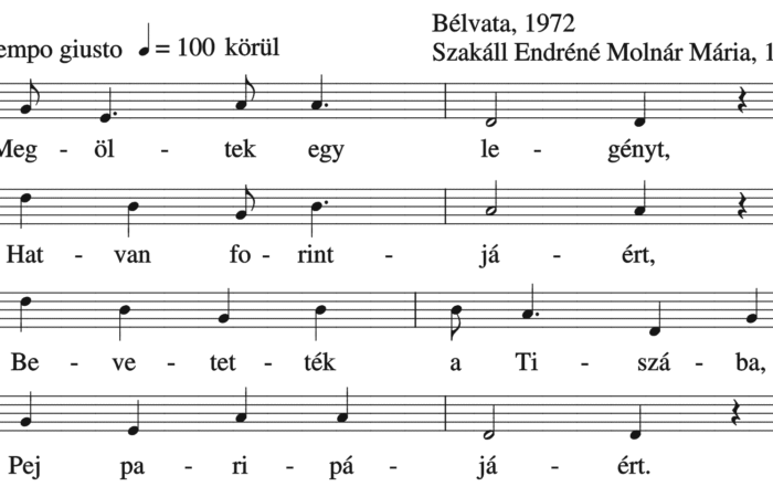 1. Megöltek ëgy legényt Hatvan forintyáéert, Tiszába bedobták Szilaj csikójáér. 2. Tisza be nem vëtte, Partyára kitëtte. Ara mënt ëgy...