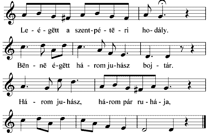 1. Leégëtt a szentpétëri hodály. Bënne égëtt három juhász bojtár. Három juhász, három pár ruhája, Számadónak sallangos bundája. 2. Számadónak...