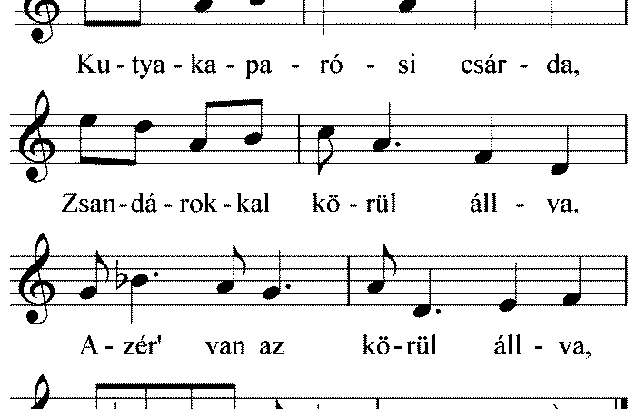 Kutyakaparósi csárda, Zsandárrú körű’állva, Azért van az körül állva, Bëtyár mulat a csárdába’. Irigyeim annyin vannak, Mint a kutyák, úgy...