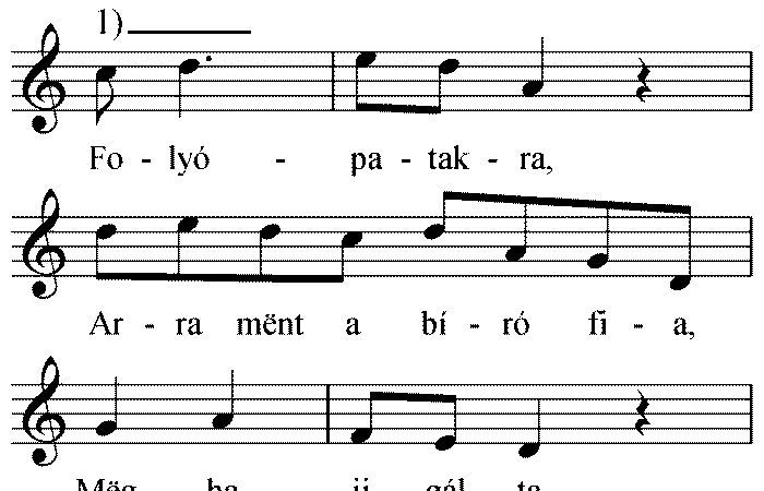 1. Kihajtottam lúdjaimat (a) Folyópatakra, Arra mënt a bíró fia, Mëghajigálta. 2. Në hajigáld bacso fija, Gémës gunaram, Haza mëgyëk,...