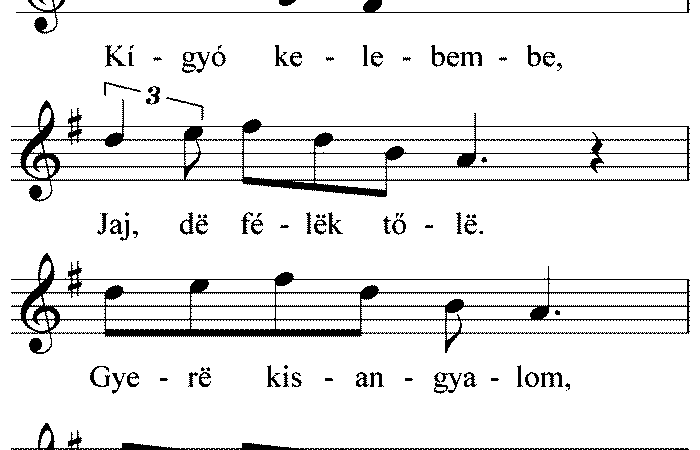 1. Kígyó kelebembe, Jaj, dë félëk tőlë. Gyerë kisangyalom, Szabadíts mëg tőlë. 2. Nëm adnálak babám, Szélës ë világér’. A...