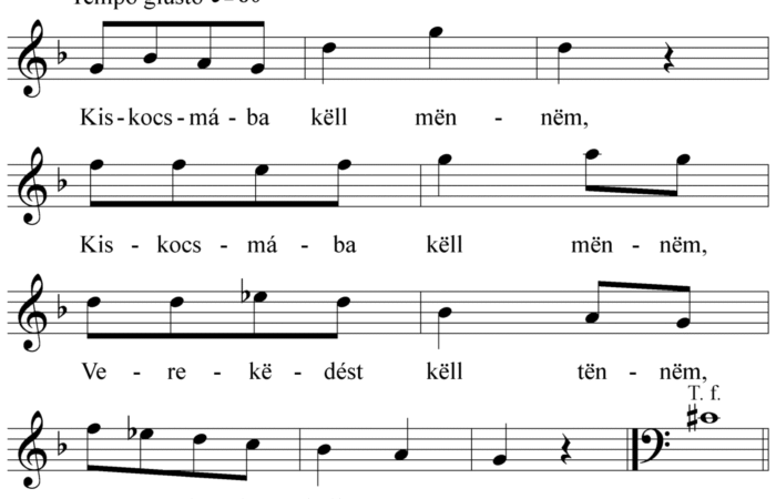 1. Kiskocsmába këll mënnëm, Kiskocsmába këll mënnëm. Verekëdést këll tënnëm, Verekëdést këll tënnëm. 2. Édësanyám édësem, Édësanyám édësem Van-ë ingëm,...
