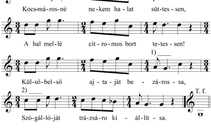 1. Kocsmárosné nekem halat süttessen, A hal mellé citromos bort tetessen! Külső-belső ajtaját bazárossa, Szógálóját trázsáro kiállítsa. 2. A szógálló...