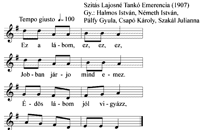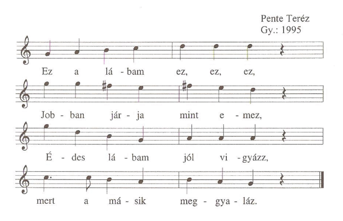 1. Ez a lábom, ez, ez, ez,Jobban járjo mint emez.Édös lábom jól vigyázz,Mert a másé legyaláz.2. Három icce köménmag,Jaj, de...