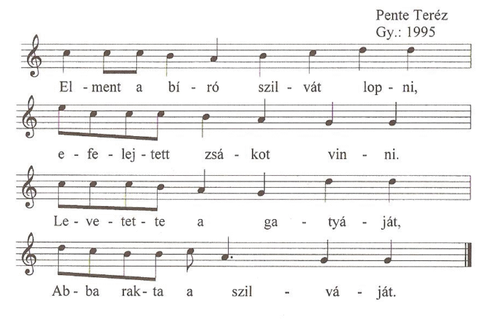 Elment a bíró szilvát lopni,Elfelejtett zsákot vinni.Levetette a gatyáját,Teli rakta a két szárát.Levetette a gatyáját,Teli rakta mindkét szárát.