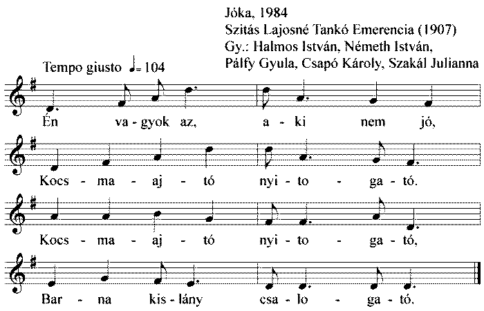 1. Én vagyok az, aki nem jó,Kocsmaajtó nyitogató.Kocsmaajtó nyitogató,Barna kislány csalogató.2. Aki hozzám adja magát,Tallér üti meg a markát.Tallér üti...