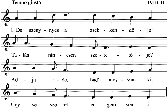 1. De szennyes a zsebkendője! Talán nincsen szeretője? Adja ide, had’ mossam ki, Úgy se szeret engem senki. 2. Kéket...