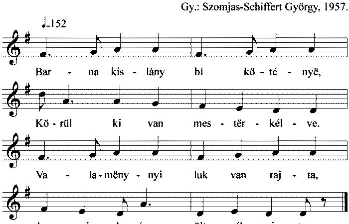 1. Barna kislány bí kötínyë, Körül ki van mestërkélve. Valemënnyi luk van rajta, Annyi legíny ült má rajta.