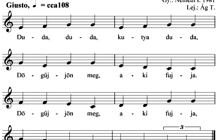 1. Duda, duda, kutya duda, Dögűjön meg aki fujja. Dögűjön meg aki fujja, Kutya duda, kutya duda 2. Aki dudás...