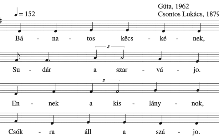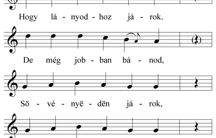Bánatos këcskének, Sudár a szarvájo. Ennek a kislánynok, Csókra áll a szájo. Idesanyám vótál, Mér nem tanítottál. Gyënge vessző vótam,...
