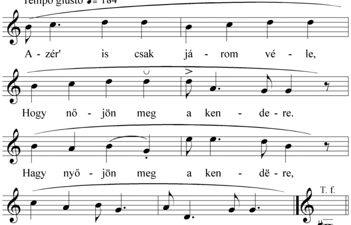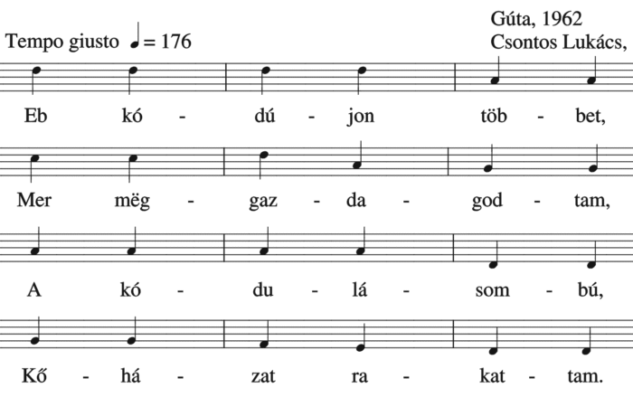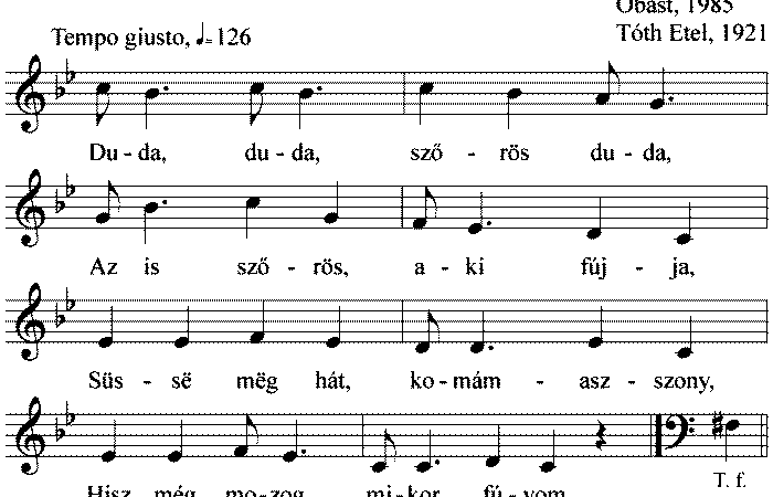 Duda, duda, szőrös duda, Az is szőrös, aki fújja, Süssë mëg hát, komámasszony, Hisz még mozog, mikor fúvom.