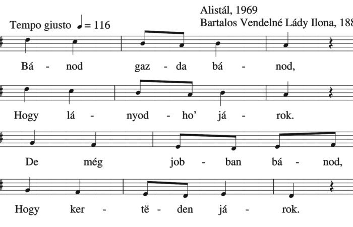 Bánod gazda, bánod, Hogy lányodho’ járok. De mégjobban bánod, Hogy kertëden járok. Mer’ a kertkapudon Olyan ríst csinálok, Nincsen annyi...
