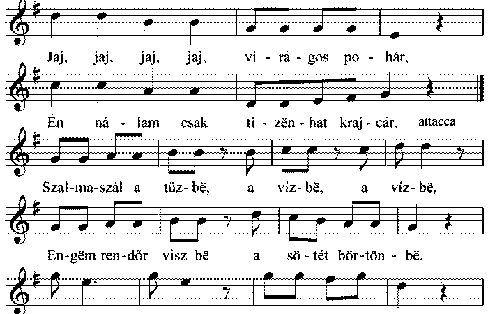 Asszonyok, embërëk ide jöjjenëk, Virágos poharat tőlem vëgyenek. Jaj, jaj, jaj, jaj, virágos pohár, Én nálam csak tizënhat krajcár. Szalmaszál...