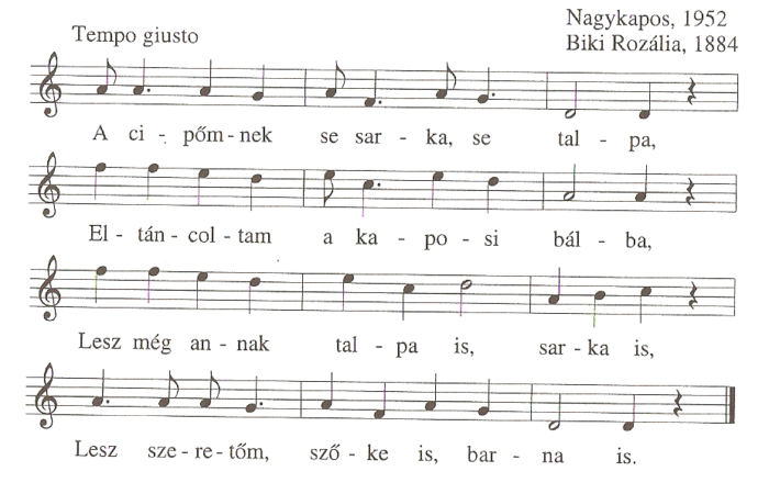 1. A cipőmnek se sarka, se talpa,Eltáncoltam a kaposi bálba,Lesz még annak talpa is, sarka is,Lesz szeretőm, szőke is, barna...