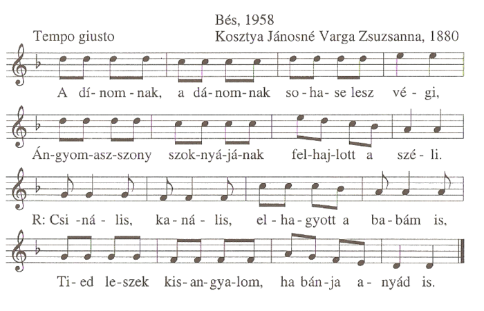 1. A dínomnak, a dánomnak sohase lesz végi,Ángyomasszony szoknyájának felhajlott a széli.Csinális, kanális, elhagyott a babám is,Tied leszek kisangyalom, ha...