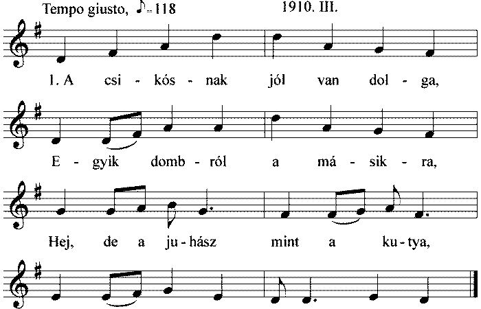 1. A csikósnak jól van dolga, Egyik dombról a másikra, Hej, de a juhász mint a kutya, Egyik dombról a...