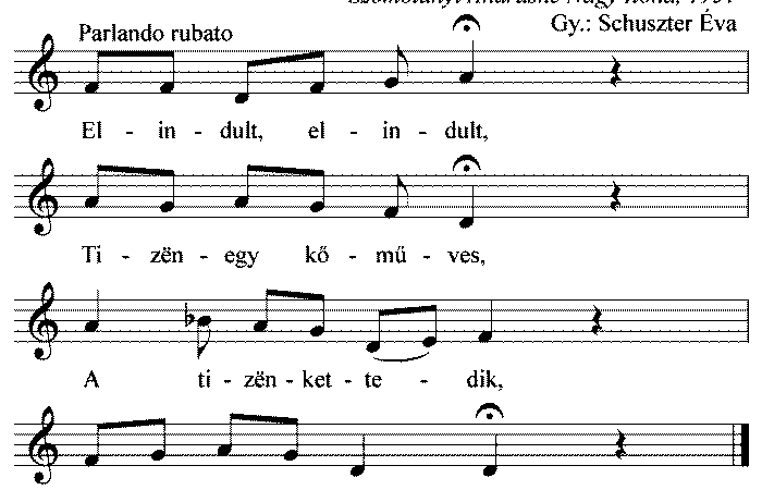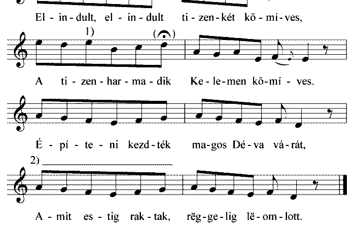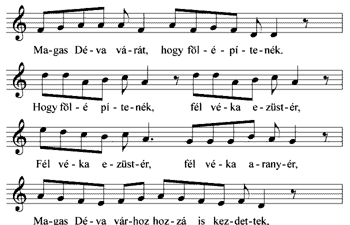 Elindult, elindult, Tizënegy kőmíves, A tizenkettedik, Kelemen kőmíves. Hogy fölépítenék, Magas Déva várát, Amit nappal raktak, Éjjel ledúvadott. Amit éjjel...