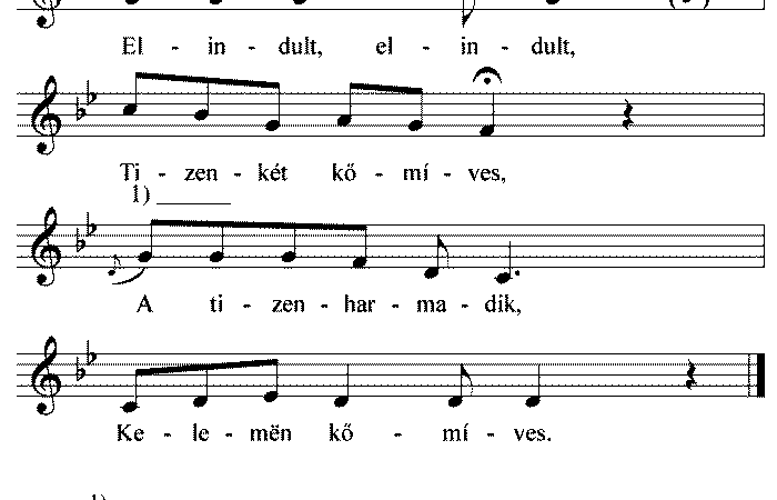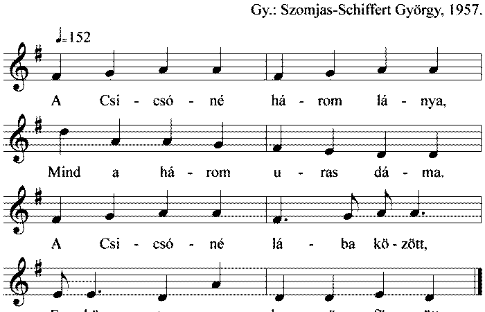 1. A Csicsóné három lánya, Mind a három uras dáma. A Csicsóné lába között, Fekëte malac röfögött.