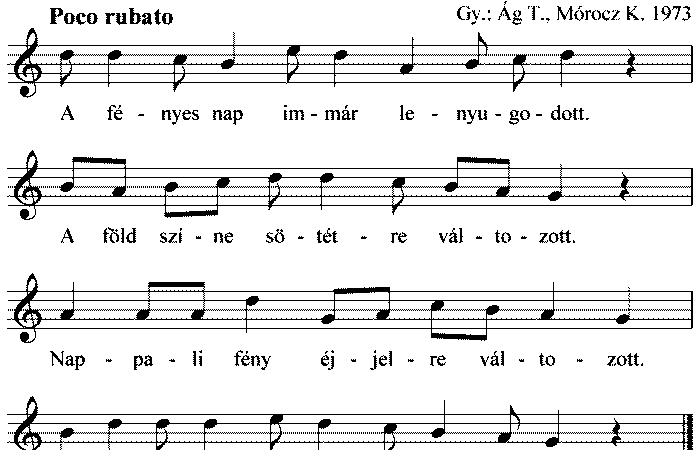 1. A fényës nap immár lënyugodott, A föld színë sötétbë maradott, Nappali fény éjjelre változott, Fáradtaknak nyugodalmat hozott. 2. Mindën...