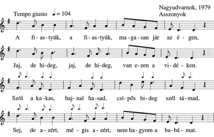 A fiastyúk, a fiastyúk, magasan jár az égen, Jaj, de hidg, jaj, de hideg, van ezen a vidéken. Szól a...