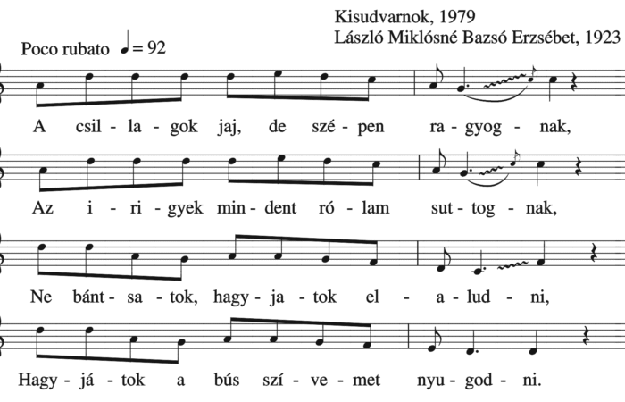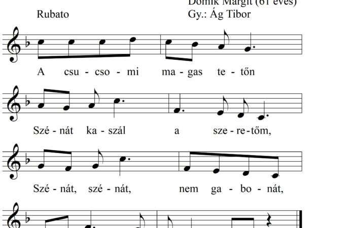 1. A csucsomi magas tetőn Szénát kaszál a szeretőm, Szénát, szénát, nem gabonát, Szőkét szeretek, nem barnát. 2. Édes volt...