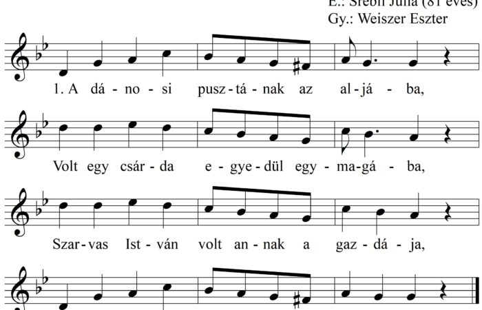 1. A dánosi pusztánok az aljábo, Állt ëgy csárdo ëgyedül ëgymagábo, Szarvas István volt annak a gazdájo, Oldalán volt felesége...