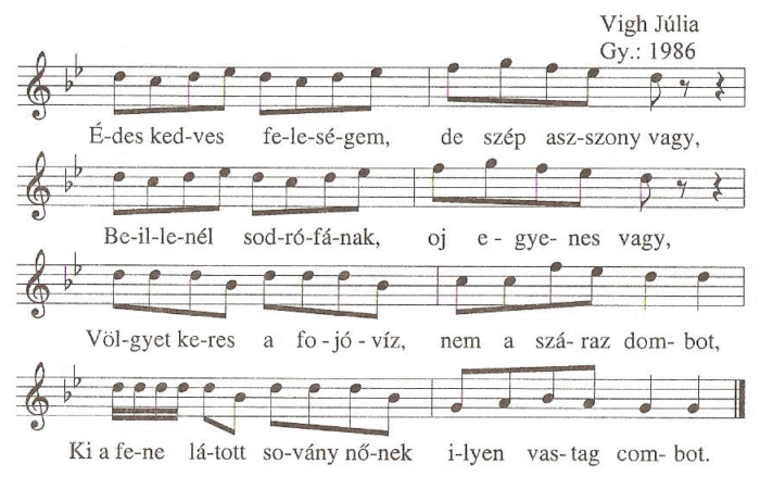 Édes kedves feleségem, de szép asszony vagy,Beillenél sodrófának oly egyenes vagy,Völgyet keres a folyóvíz, nem a száraz dombot,Ki a fene...