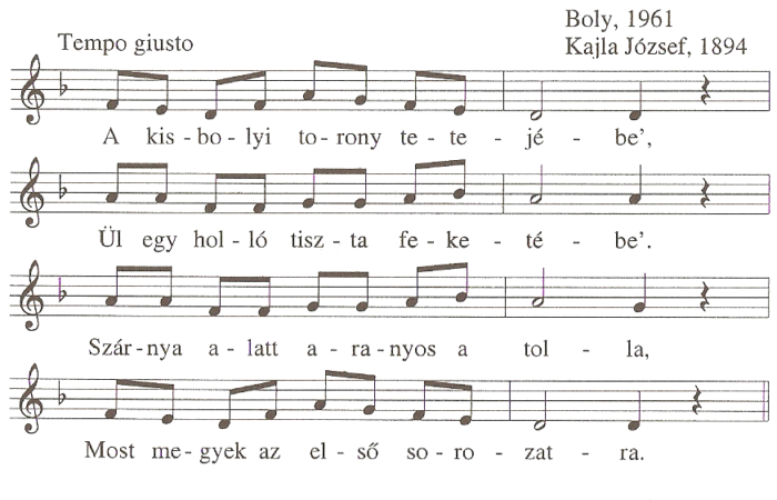 1. A kisbolyi torony tetejébe,Ül egy holló tiszta feketébe.Szárnya alatt aranyos a tolla,Most megyek az első sorozatra.2. Bizony, bizony, te...