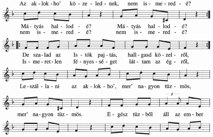 A kakasok szípen szólnak, Mátyás hallod-é? Az aklokho’ közelednek, nem ismered-é? Mátyás hallod-é?  Mátyás hallod-é? Nem ismered-é?  Nem ismered-é? De szalad...