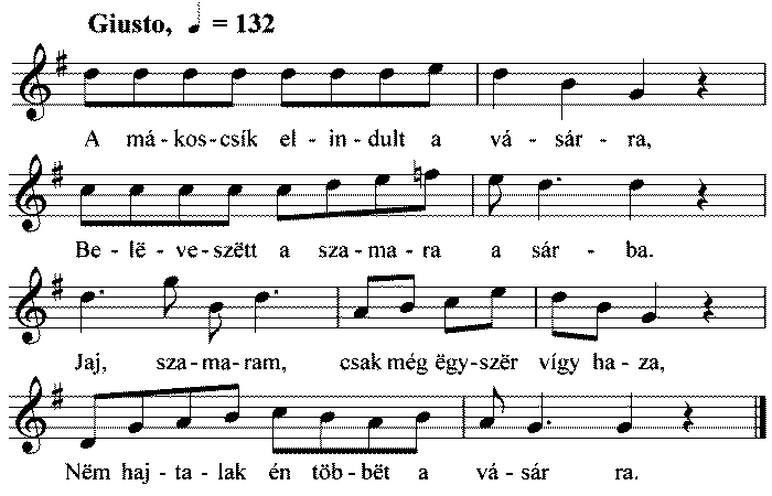 A mákoscsík elindult a vásárra, Belëveszëtt a szamara a sárba. Jaj, szamaram, csak még ëgyszër vígy haza, Nëm hajtalak én...
