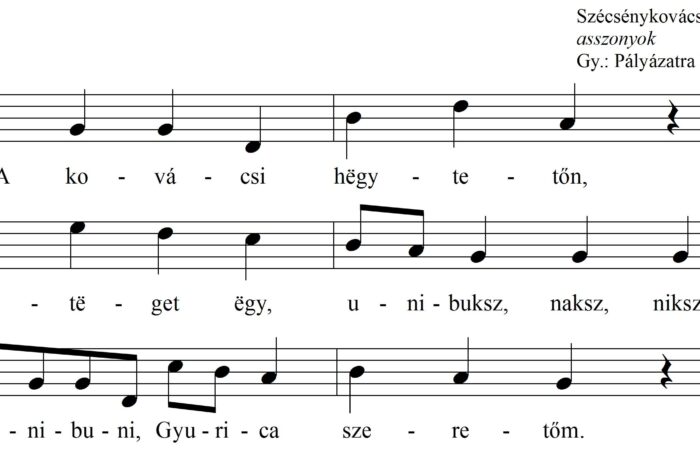 1. A kovácsi hëgytetőn, Intëget ëgy, unibuksz, naksz, niksz, Uni-buni, Gyurica szeretőm. 2. De hijába intëget, Úgy sëm lëszëk, unibuksz, naksz, niksz,...