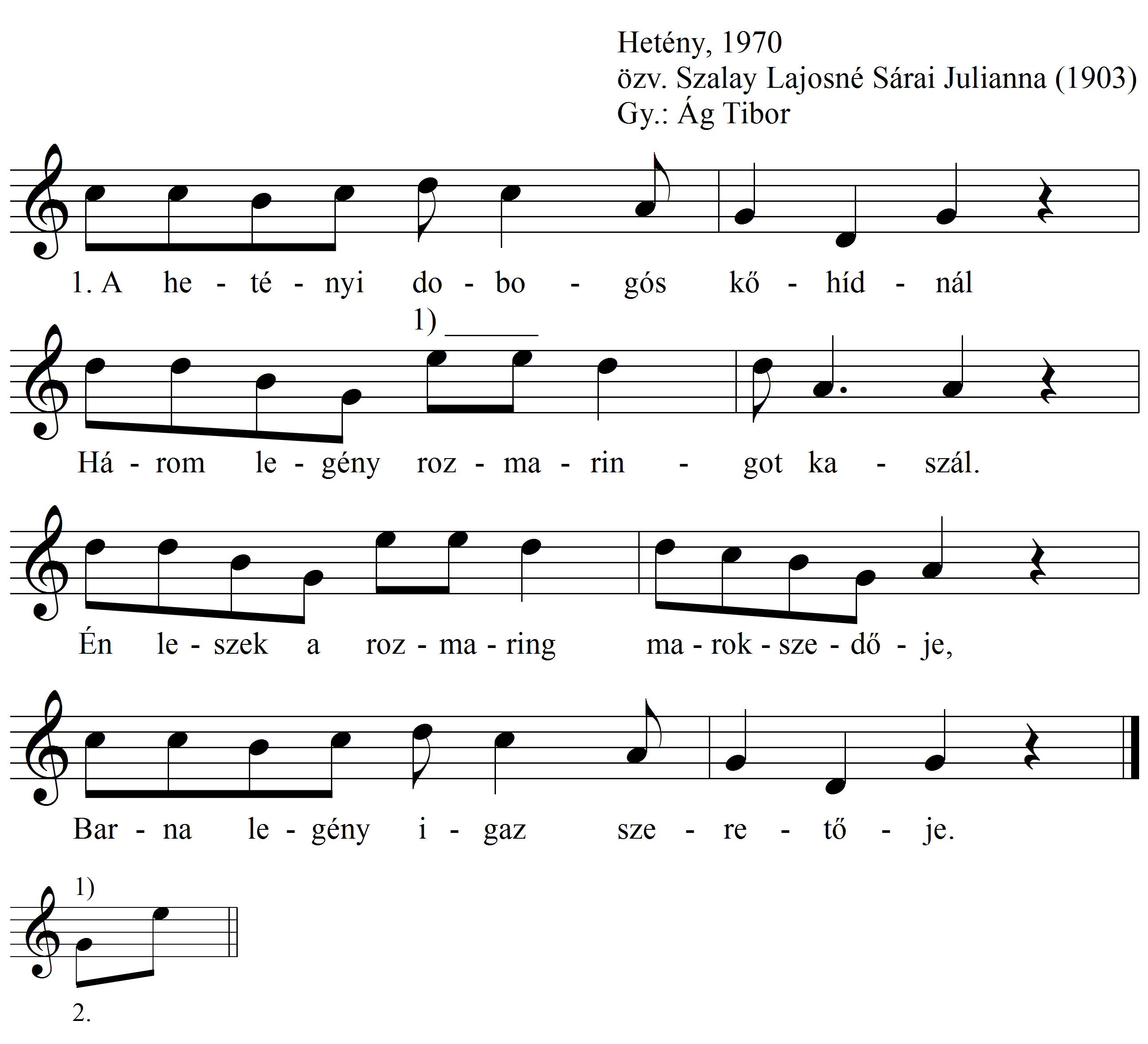 1. A hetényi dobogós kőhídnál, Három legény rozmaringot kaszál, Én leszek a rozmaring marokszedője, Barna legény igaz szeretője. 2. Jaj, de sokat...