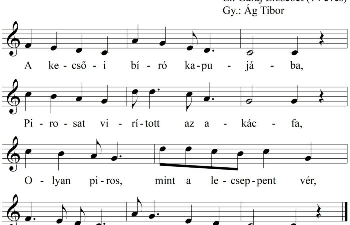 1. A kecsői bíró kapujába, Pirosat virított az akácfa, Olyan piros, mint a lecseppent vér, Fáj a szívem a bíró...