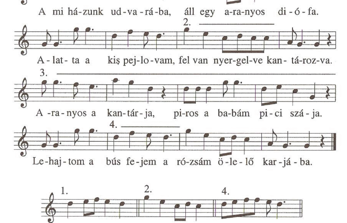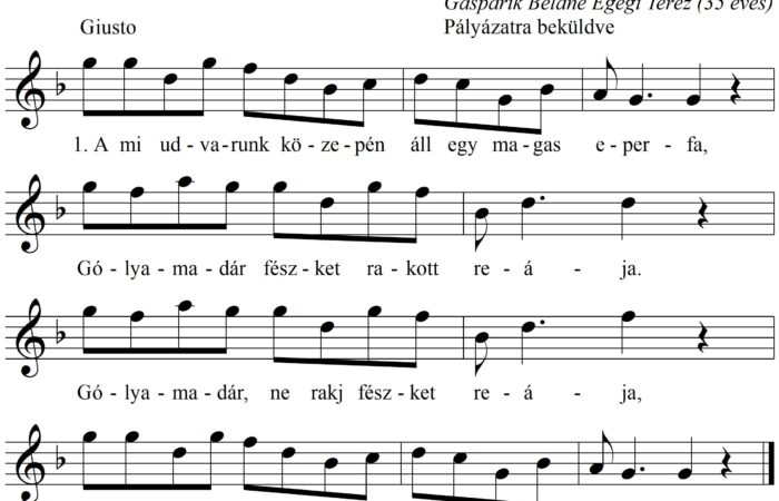 1. A mi udvarunk közepén áll egy magas eperfa, Gólyamadár fészket rakott reája. Gólyamadár ne rakj fészket reája, Inkább rakj...