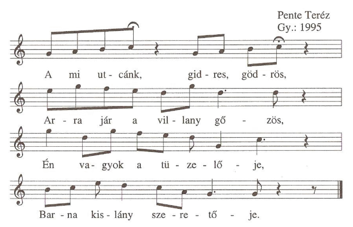 1. A mi utcánk gidres, gödrös,Arra jár a villany gőzös,Én vagyok a tüzelője,Barna kislány szeretője.2. Házunk előtt jár a pósta,Jaj,...