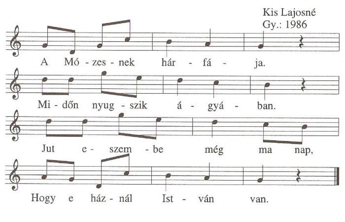 1. A Mózesnek hárfája.Midőn nyugszik ágyamban.Jut eszembe még ma nap,Hogy e háznál István van.2. Jöttünk hozzá most este.Köszöntsük egészséggel.Ha megérte...