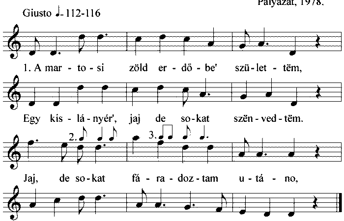 1. A martosi zöld erdőbe’ születtëm, Egy kislányér’, jaj, de sokat szënvedtëm, Jaj, de sokat fáradoztam utáno, Mégis ki vagyok...