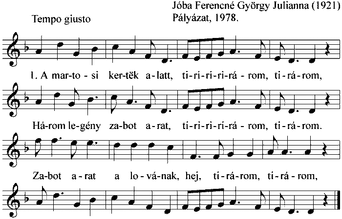 1. A martosi kertëk alatt, tiririri rárom, tirárom, Három legény zabot arat, tiririri rárom, tirárom. Zabot arat a lovának, hej,...