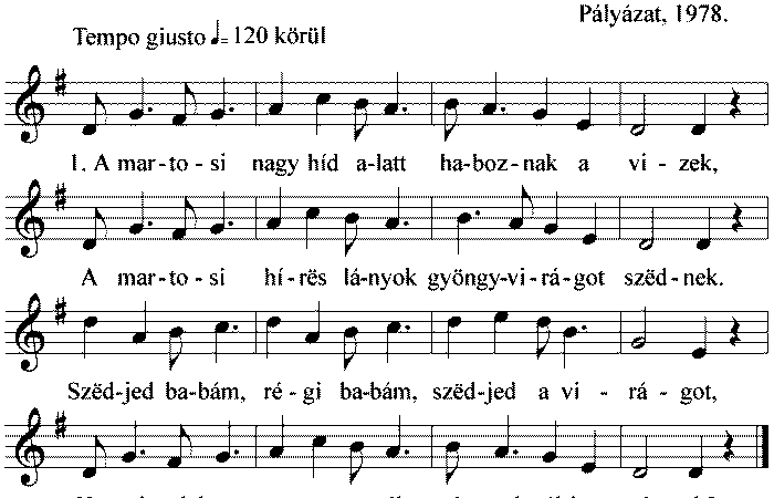1. A martosi nagy híd alatt haboznak a vizek, A martosi hírës lányok gyöngyvirágot szëdnek. Szëdjed, babám, régi babám, szëdjed...