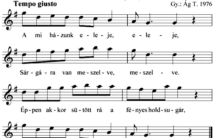1. A mi házunk eleje, eleje, Sárgára van meszelve, meszelve. Éppen akkor sütött rá a fényes holdsugár, Mikor mondtam, babám...