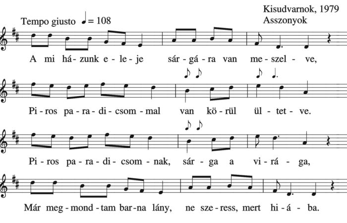 A mi házunk eleje sárgára van meszelve, Piros paradicsommal van körül ültetve. Piros pradicsomnak sárga a virága, Már megmondtam barna...
